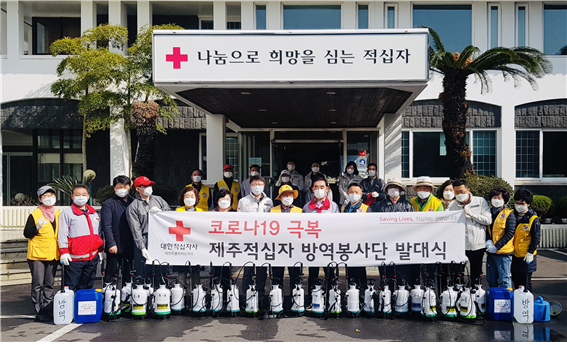 대한적십자사제주특별자치도지사(회장 오홍식)는 3월 21일 적십자사 마당에서 봉사원 30여명이 참가한 가운데 코로나19 확산을 예방하고 도민의 건강을 보호하기 위한 적십자 방역 봉사단 발대식을 개최했다.