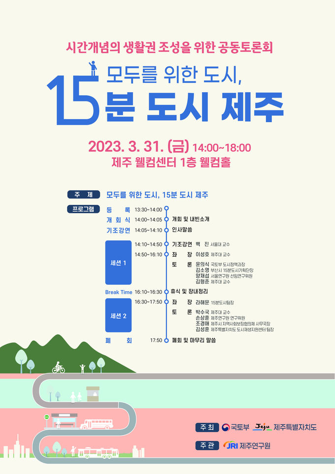 제주특별자치도는 국토교통부와 공동으로 오는 31일 오후 2시 제주웰컴센터 웰컴홀에서 ‘모두를 위한 도시, 15분 도시 제주’를 주제로 정책 토론회를 개최한다.