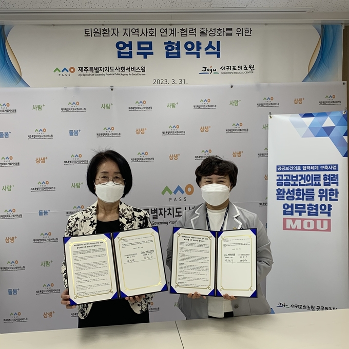 (재)제주특별자치도사회서비스원(원장 양시연)과 서귀포의료원(원장 박현수)은 퇴원환자의 신속한 돌봄 서비스 제공을 통해 안정적인 지역사회 복귀 지원을 위한 업무협약을 체결하였다.