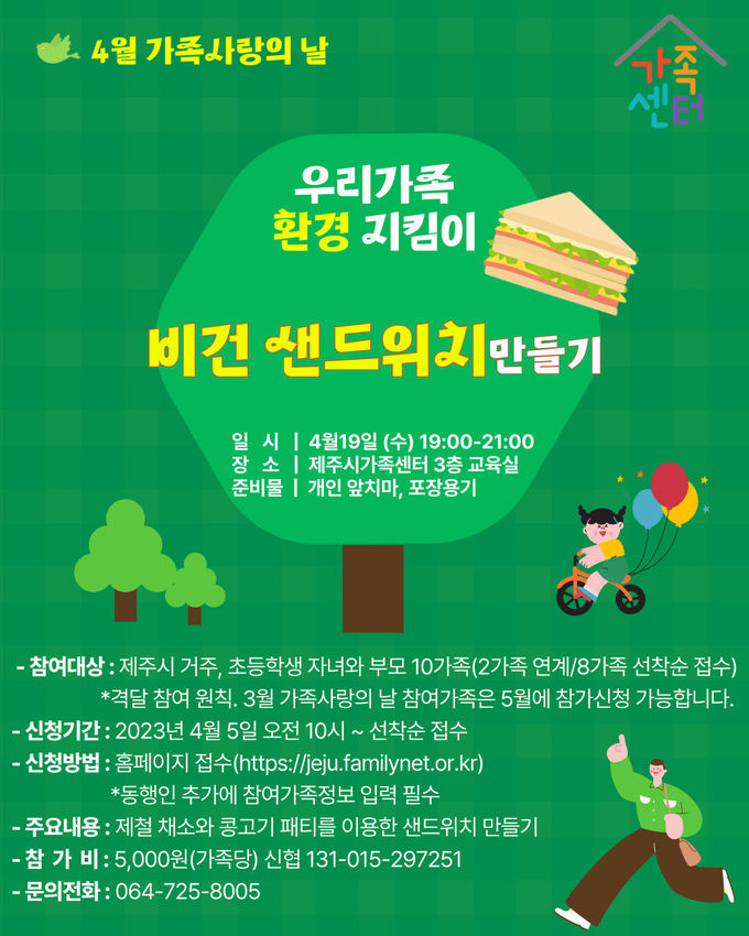 신청은 제주시에 거주하는 초등학생과 부모로 구성된 가족이면 누구나 가능하며 제주시가족센터 홈페이지(http://jeju.familynet.or.kr)를 통해 가능하다.