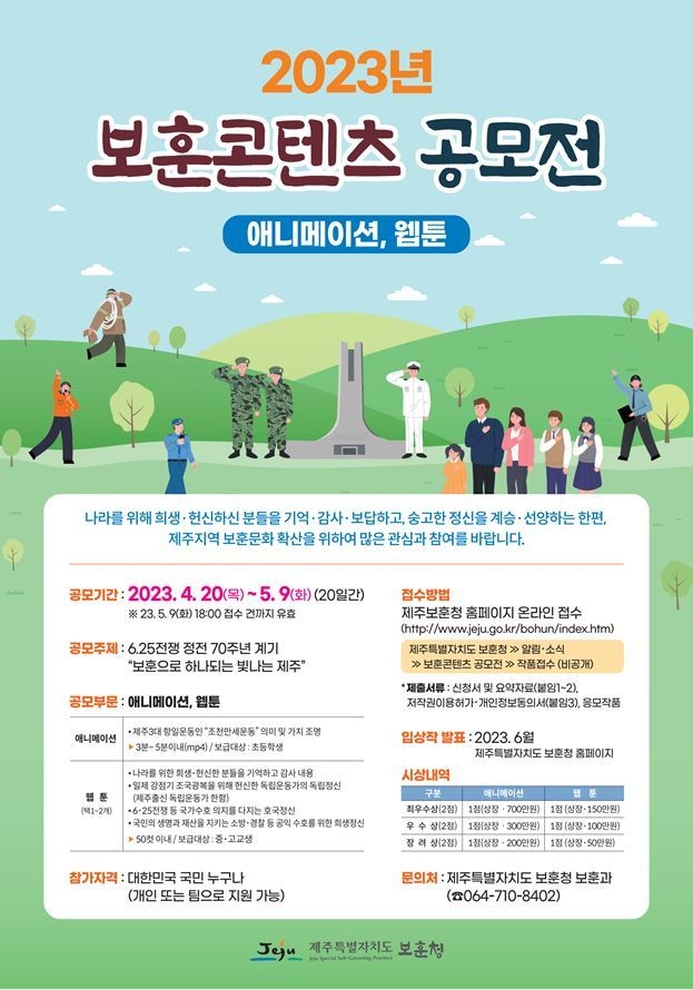 제주특별자치도 보훈청(청장 양홍준)은 6・25전쟁 정전 70주년을 맞아 ‘보훈으로 하나되는 빛나는 제주’를 주제로 한 ‘2023년 보훈콘텐츠 공모전’을 전 국민 대상으로 재공고한다.