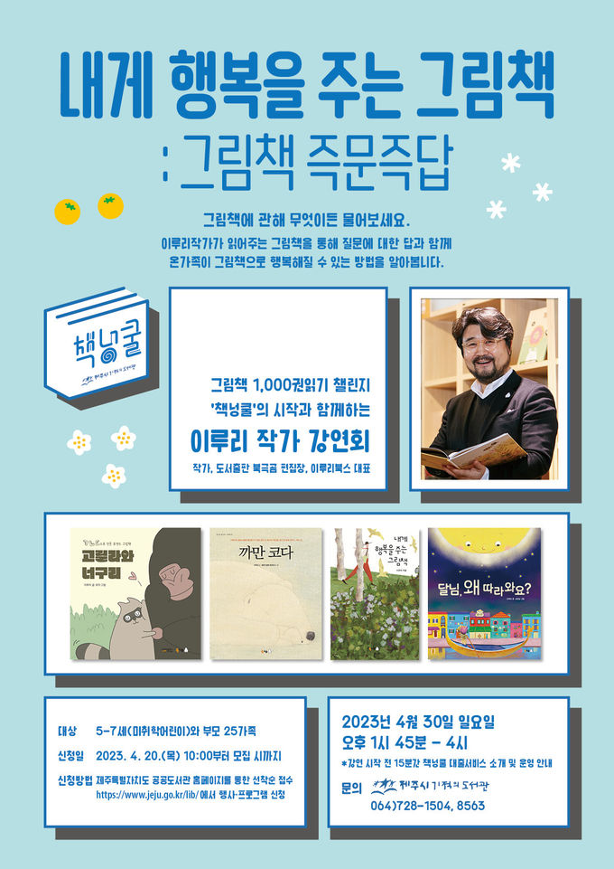 이와 함께 ‘내게 행복을 주는 그림책’이란 주제로 이루리 작가를 초빙해 온 가족이 그림책으로 행복해지는 방법을 찾는 ‘그림책 즉문즉답’시간이 4월 30일(일) 오후 1시45분부터 기적의도서관에서 진행된다.