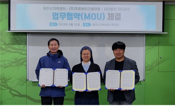 제주시가족센터(센터장 이영은)는 ㈜푸른바이크쉐어링(대표 이사 김형찬), 사단법인 자타공인(이사장 김후배)과 가치지향적 소비 문화의 확산과 가족복지분야의 상호 교류 및 협력을 위한 업무협약을 체결했다.