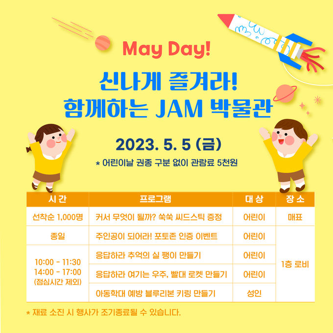 어린이날인 5월 5일에는 온 가족이 함께 즐길 수 있도록 모든 관람객은 5000 원에 박물관 이용이 가능하다.