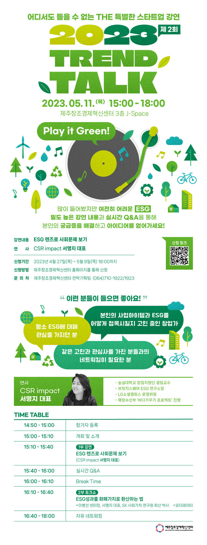 이번 2회차 트렌드 토크는 ESG를 주제로 CSR임팩트 서명지 대표가 주요 강연자로 나서며 오는 11일 오후 3시 제주벤처마루 3층 J-Space에서 개최될 예정이다.