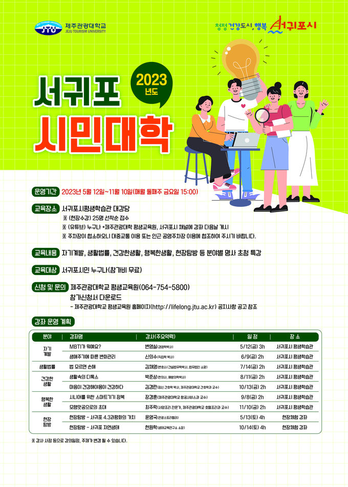 서귀포시와 제주관광대학교가 운영하는 ‘2023년 서귀포시민대학’은 서귀포시민을 대상으로 5월부터 11월까지 매월 1회 (매월 둘째 주 금요일)실시되며, 자기계발․디지털․건강분야 등 시민역량 강화 및 변화하는 사회와 소통을 위한 다양한 분야의 강좌를 제공할 예정이다.