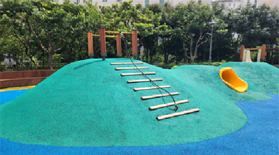 또한 놀이공간 외각에 인라인 트랙 및 저학년을 위한 모래놀이터 설치 등 연령대별 공간 분리를 통하여 안전사고를 예방하고 목재스탠드를 설치하여 보호자들도 즐길 수 있는 커뮤니티마당을 조성하였다.