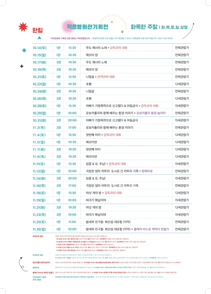 문의: (재)제주영상·문화산업진흥원 한림작은영화관 ☎064-796-0813
