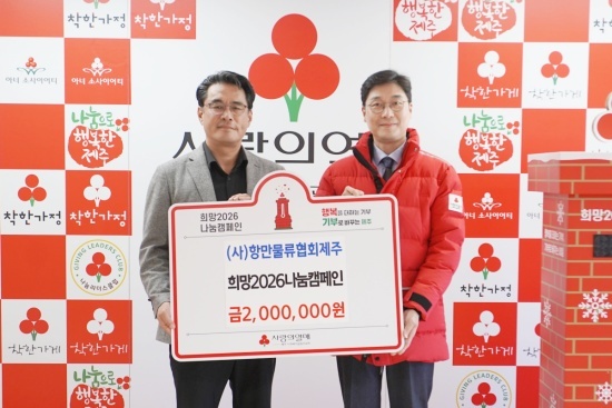 (사)항만물류협회제주(회장 강영근)는 지난 9일, 제주사회복지공동모금회(회장 강지언)를 방문해 희망2026나눔캠페인 이웃사랑 성금 200만 원을 기탁했다.