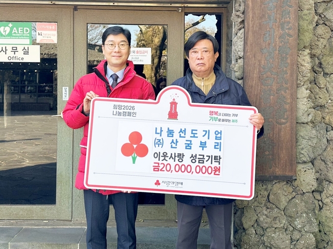 나눔선도기업 ㈜산굼부리(대표 김대식)는 지난 10일, ㈜산굼부리 사무실 앞에서 희망2026나눔캠페인 성금 2천만 원을 제주사회복지공동모금회(회장 강지언)에 기탁했다.