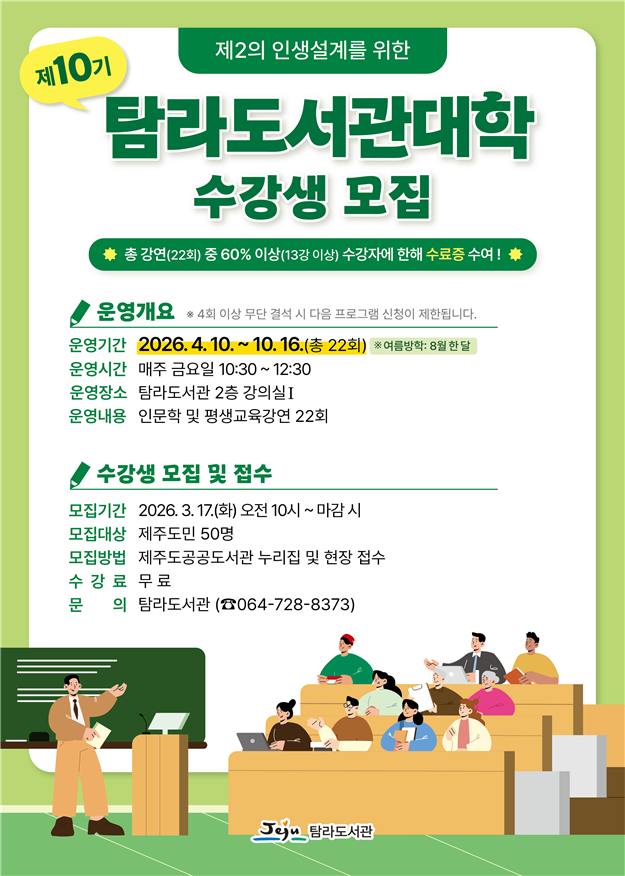 탐라도서관은 지역 주민의 평생교육과 삶의 질 향상을 위해 ‘제10기 탐라도서관대학’ 수강생을 오는 3월 17일부터 모집한다.