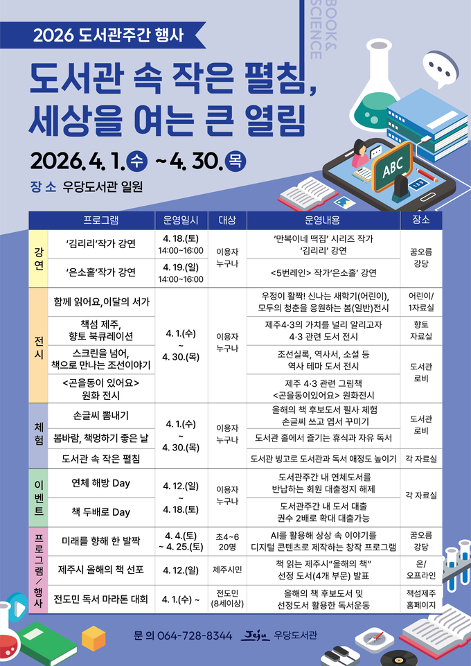 도서관 로비에서는 ‘제주시 올해의 책 필사로 손글씨 뽐내기’, ‘봄바람, 책멍하기 좋은 날’, ‘도서관 속 작은 펼침(도서관 빙고)’, ‘곤을동이 있어요’ 원화 전시, ‘스크린을 넘어, 책으로 만나는 조선이야기’ 등 다채로운 전시와 체험행사도 함께 열린다.