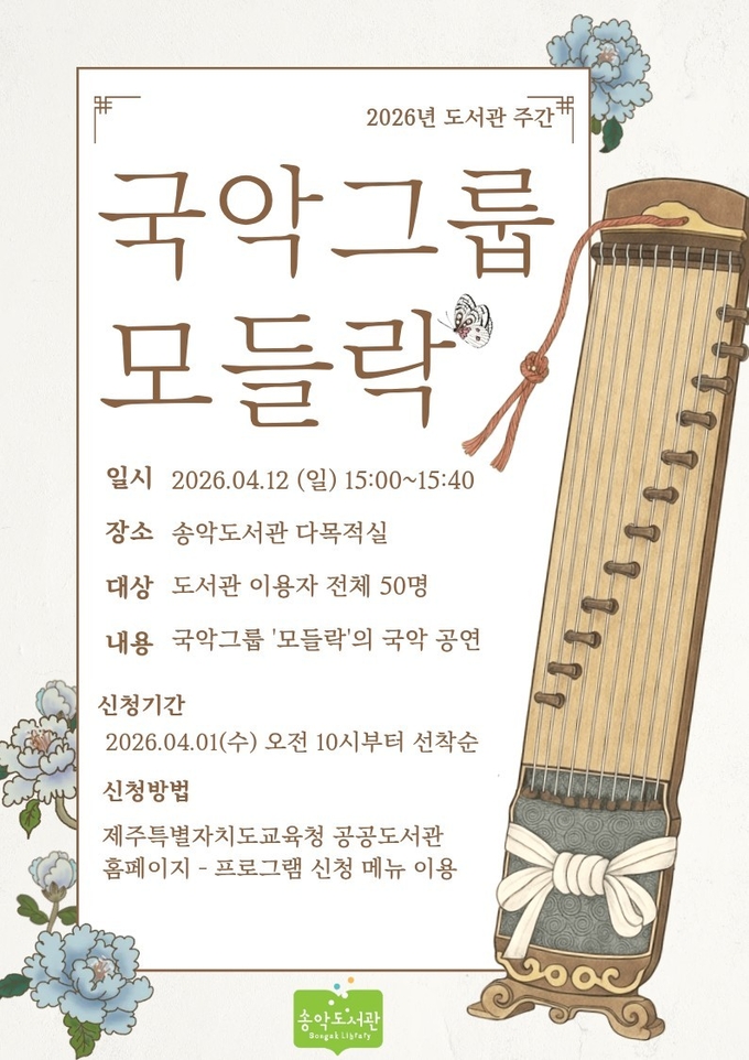 송악도서관(분관장 고도현)은 오는 12일 송악도서관 다목적실에서 ‘모들락! 신나는 국악 여행’을 주제로 국악 공연을 개최한다.