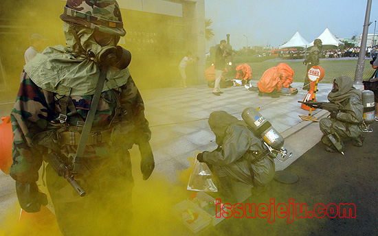 제주방어사령부 대원들이 화학물질을 검출작업을 하고 있다. ⓒ 김영하 기자 |