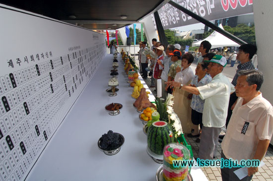 태평양전쟁 희생자 합동 위령제가 한라체육관 광장에서 유족들이 헌화 분향을 하고 있다. ⓒ 김영하 기자 |