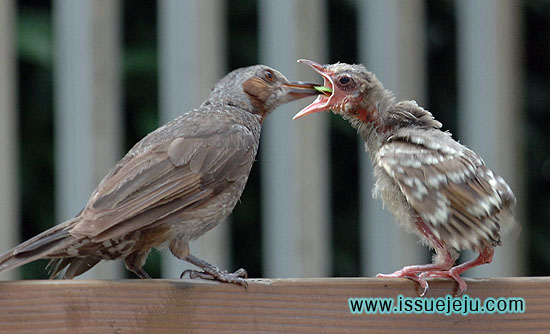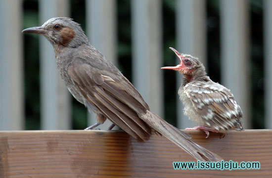 어미직박구리가 주위에서 안타까운 표정으로 새끼를 지켜보고 있다. ⓒ 김영하 기자 |