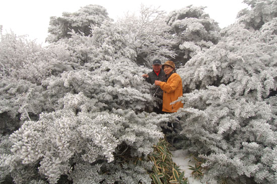 상고대 맺힌 나무숲 사이로 걸어가는 등산객들 ⓒ 김영하 기자 |