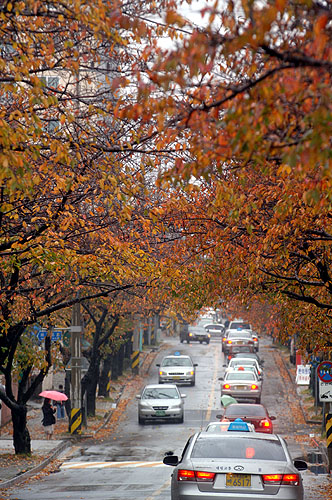 27일 겨울을 제촉하는 비가 촉촉히 내리고 있는 가운데 제주시 전농로에 가로수들이 가는 가을이 아쉬운 듯 붉게 변하고 있다. ⓒ 김영하 기자 |
