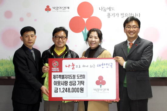제주특별자치도청 도르미(회장 이지훈)는 12월 27일 제주사회복지공동모금회를 방문하여 이웃사랑 성금 1,248,000원을 기탁했다.