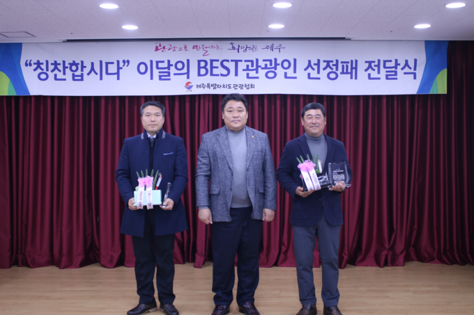 제주특별자치도관광협회(회장 부동석)는 2019년 12월 12일(목) 제주종합비지니스센터 3층 대회의실에서 “칭찬합시다” 이달의 베스트 관광인을 선정하고 선정패와 친절 키움 꽃 화분을 전달하였다.