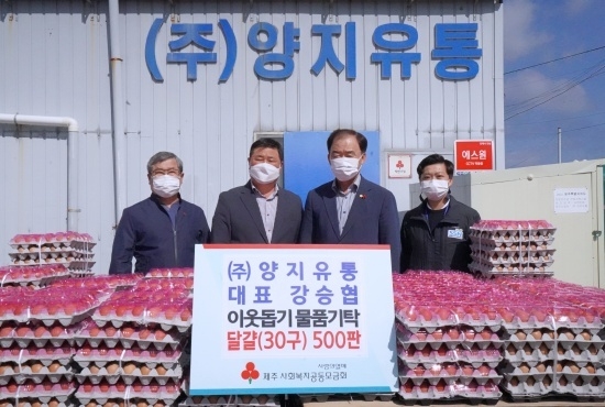 ㈜양지유통(대표 강승협)은 지난 12일 양지유통에서 도내 어려운 이웃을 위해 전해 달라며 계란 500판을 제주사회복지공동모금회(회장 김남식)에 기탁했다.