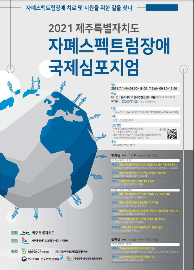 제주특별자치도는 7월 1·2일 이틀 동안 제주한라대학교 컨벤션센터에서 줌(ZOOM) 온라인 화상회의 플랫폼을 활용해 2021년 자폐스펙트럼장애 국제심포지엄을 개최한다고 밝혔다.