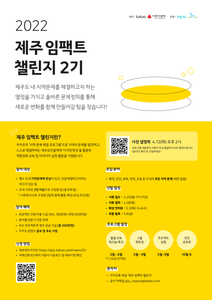 카카오(대표 남궁훈)가 제주사회복지공동모금회(회장 강지언)과 함께하는 제주도민 주도형 지역문제 해결 프로그램 ‘제주 임팩트 챌린지 2기’ 참가 팀을 모집한다고 4일 밝혔다.