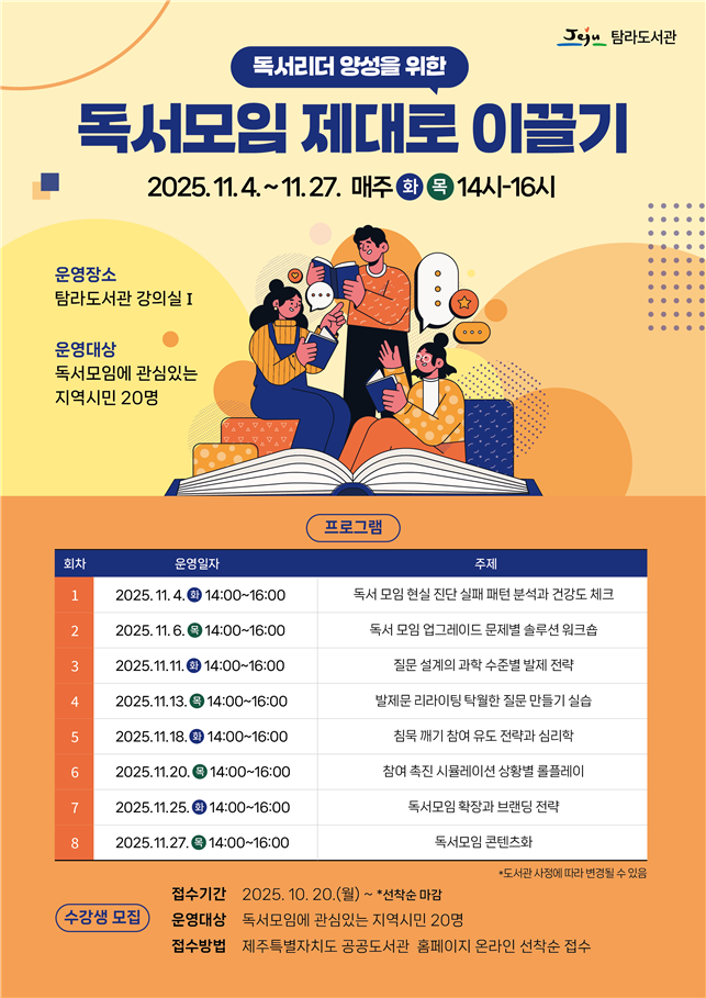 탐라도서관은 독서 리더 양성과 독서 문화 확산을 위해 ‘독서모임 제대로 이끌기’ 강좌를 운영한다.
