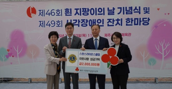 이번 성금은 스완스라이온스클럽 회원들이'제46회 흰지팡이의 날'을 기념해 시각장애인들의 복지증진을 위해 마련한 것으로, (사)한국시각장애인연합회 제주특별자치도지부를 통해 도내 시각장애인 복지를 향상하기 위한 사업으로 사용될 예정이다.