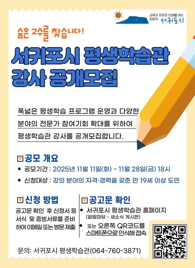 서귀포시 관계자는 “이번 공모를 계기로 지역 내 다양한 전문가들이 강사로 참여할 수 있는 기회를 넓히고, 성과에 따라 순환할 수 있는 강사 운영 구조를 만들어갈 예정”이라며, “시민의 재능이 지역의 배움으로 이어지는 평생학습 문화가 확산되기를 기대한다”라고 말했다.
