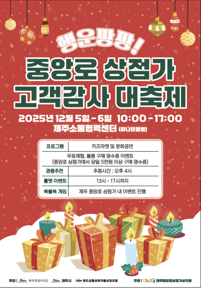이번 행사는 중소벤처기업부 공모사업으로 선정돼 올해부터 추진 중인 ‘상권활성화사업’의 일환으로, 제주원도심활성화자율상권조합*과 함께 원도심 상권인 중앙로 상점가에 활기를 불어넣기 위해 마련됐다.