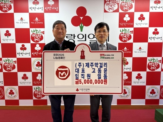 ㈜제주막걸리(대표 고동윤)는 최근 모금회 나눔실에서 지역사회 어려운 이웃을 위해 사용해 달라며 희망2026나눔캠페인 성금 500만원을 제주사회복지공동모금회(회장 강지언)에 기탁했다.