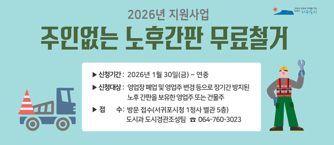 서귀포시는 안전하고 쾌적한 도시경관 조성 및 소상공인의 경영 안정을 도모하기 위해 오는 30일부터 ‘2026년 주인없는 노후간판 무료철거 지원사업’ 대상자를 연중 모집한다.