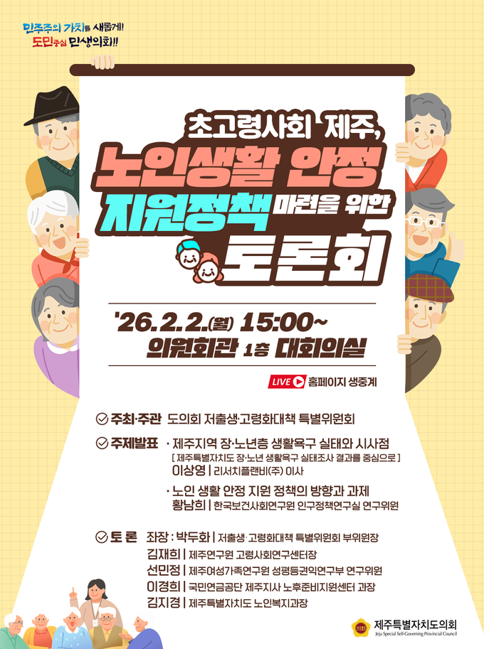 2일 도의회 대회의실에서 제주특별자치도의회 저출생‧고령화대책 특별위원회(위원장 이정엽) 주최‧주관으로‘노인 생활 안정 지원 정책 방향’정책토론회가 열린다.