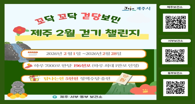 김철영 건강증진과장은 “꼬닥꼬닥 걷당보민은 제주어로 ‘천천히 꾸준히 걷다 보면’이라는 뜻”이라며, “누구나 일상에서 걷기를 실천할 수 있는 건강 챌린지인 만큼 시민들의 높은 걷기 실천 성과를 바탕으로 걷기 생활화를 더욱 확산해 나가겠다”고 말했다.