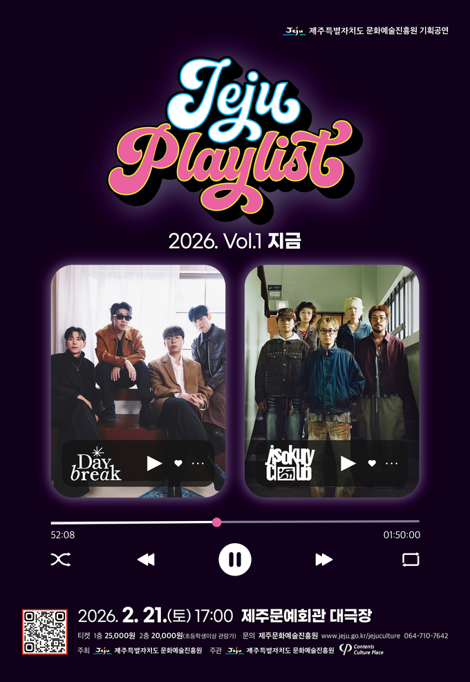 제주특별자치도 문화예술진흥원은 2026년 신년을 맞아 젊은 세대가 선호하는 뮤지션을 초청한 기획공연 ‘JEJU PLAYLIST 2026 VOL.1 지금’을 오는 2월 21일 오후 5시 문예회관 대극장에서 개최한다고 밝혔다.
