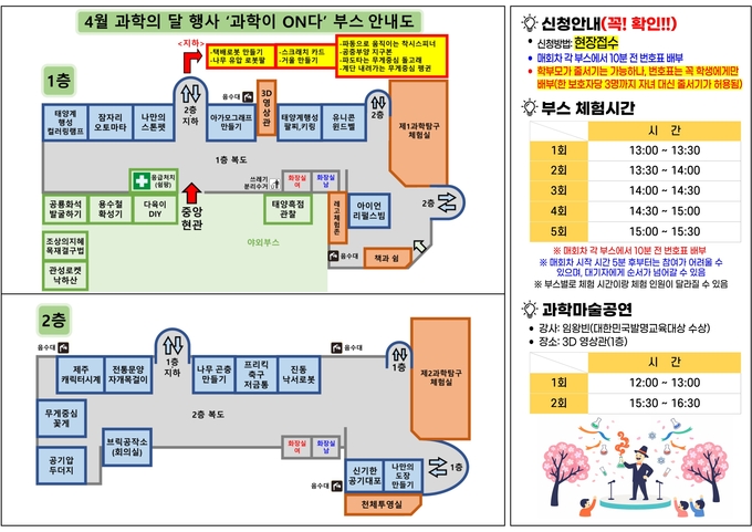 과학 마술 공연은 정오부터 오후 1시까지, 오후 3시 30분부터 4시 30분까지 1층 영상관에서 대한민국발명교육대상 수상자인 임왕빈 강사가 과학 원리를 흥미롭게 풀어내는 체험형 공연으로 총 2회 운영된다.