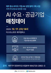 제주특별자치도와 제주테크노파크는 17일 오후 2시 첨단과기단지 내 이스트소프트 제주캠퍼스에서 ‘제주 바이오기업 인공지능 전환(AX)을 위한 인공지능(AI) 수요·공급 매칭 행사’를 개최한다. 이번 행사는 제주도가 지난 10월 중소벤처기업부의 ‘지역 주도형 인공지능(AI) 대전환 사업’ 공모에 선정되면서 본격 추진됐다. 도내 바이오기업을 대상으로 사업을 소개하고, 실제 지원을 받을 참여 기업을 모집하는 자리다. 제주도는 이번 사업으로 ‘인공지능(AI) + B(바이오) AX 대전환 선도모델 구축’을 내걸고 도내 바이오기업 경쟁력을 높여나간다. 도내 바이오기업 50개사와 도내외 인공지능(AI) 솔루션 공급기업 30개사를 모집하고 있으며, 기업 간 매칭을 진행하고, 최종 도내 20개 내외 기업에 맞춤형 인공지능(AI) 솔루션을 제공할 계획이다. 인공지능(AI) 솔루션을 도입하면 바이오기업의 생산성과 효율성이 높아져 매출 증가는 물론 기술 연구개발(R&D)도 활발해질 전망이다. 행사에서는 지원사업 소개와 바이오기업의 인공지능(AI) 도입 성공 사례를 발표하고, 향후 중소벤처기업부와 중소벤처기업진흥공단의 사업 정책방향도 안내한다. 제주도는 시범 사업으로 매출 증