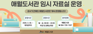 애월도서관은 리모델링 공사로 휴관(3.1.~12.31.)하는 가운데 지역 주민의 독서문화 향유 기회를 지속적으로 제공하기 위해 임시 자료실을 운영한다. 임시 자료실은 오는 3월 30일(월)부터 애월체육관(애월읍 일주서로 6349) 2층 다목적실에 마련해 운영한다. 평일 오전 9시부터 오후 8시까지 이용할 수 있으며, 주말과 공휴일은 휴관한다. 자료실에서는 도서 대출·반납 서비스를 제공해 휴관 기간 중 이용자의 독서활동 공백을 최소화할 계획이다. 또한 도서관 방문이 어려운 지역 아동센터와 복지기관을 대상으로 ‘찾아가는 도서 서비스’를 운영해 도서 이용 접근성을 높일 예정이다. 이와 함께 공원 등 야외 공간을 활용한 독서·체험 프로그램과 미술관 등 지역 문화시설과 연계한 프로그램을 운영해 독서 문화 서비스의 연속성을 유지해 나갈 방침이다. 문정희 탐라도서관장은 “이번 임시 운영은 단순한 서비스 공백 보완을 넘어 다양한 공간에서 독서와 문화를 접할 수 있는 계기가 될 것”이라며, “임시 자료실과 찾아가는 프로그램에 시민 여러분의 많은 관심과 참여를 바란다”고 말했다.