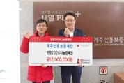 ㈜제주막걸리(대표 고동윤)는 최근 모금회 나눔실에서 지역사회 어려운 이웃을 위해 사용해 달라며 희망2026나눔캠페인 성금 500만원을 제주사회복지공동모금회(회장 강지언)에 기탁했다. 이번 성금은 도민들의 성원에 보답하고 지역사회와 따뜻한 나눔을 함께하기 위해 고동윤 대표와 제주막걸리 임직원들이 십시일반 하여 마련된 것으로, 제주도 내 취약계층의 생계비와 의료비 등 복지 지원에 사용될 예정이다. 고동윤 대표는 “제주에서 받은 사랑을 제주에 다시 돌려드리는 것이 기업의 역할이라 생각한다”며 “작은 정성이지만 이웃들에게 도움이 되길 바라며, 앞으로도 제주와 함께하는 나눔을 실천해 나가겠다”고 전했다. 한편 고동윤 대표는 제주 아너 소사이어티 142번째 회원이며, 제주사회복지공동모금회에 지속적으로 성금과 물품을 기탁하고 있다. 또한 ㈜제주막걸리는 2011년부터 상품 외부에 사랑의열매 로고를 부착하는 ‘공익 연계 마케팅 협약(CRM)’을 맺고 수익의 일부를 적립하여 매년 지속적인 나눔을 실천해오고 있다.