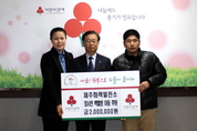 효돈농협(조합장 김성언) 하나로마트는 11월 15일 효돈농협 조합장실에서 하나로마트 공익기금 300만원을 제주사회복지공동모금회(회장 김순두)에 기탁했다.이번 성금은 지역사회와 함께하는 기업의 사회환원을 위해 하나로마트 수익금 중 일부분을 기탁한 것으로, 작년에도 공익기금 300만원을 기탁한 바 있다.김성언 조합장은“앞으로도 관내 어려운 이웃을 위해 노력하고 복지사회 구축에 밑거름이 되는 농협이 되도록 임직원이 최선을 다해 노력하겠다”고 말했다.