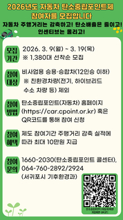 서귀포시는 오는 3월 9일부터 3월 19일까지 수송부문 온실가스 감축 프로그램인 자동차 탄소중립포인트제 참여자 1,380명을 선착순 모집한다고 밝혔다. 자동차 탄소중립포인트제는 휘발유, 경유, LPG연료를 사용하는 12인승 이하 비사업용 승용차와 승합차를 대상으로 주행거리 감축 실적에 따라 연 1회 인센티브를 지급하는 제도로 법인 또는 단체 소유와 영업용, 친환경차량(전기․하이브리드․수소차량)은 대상에서 제외된다. 참여를 희망하는 경우 모집기간 내에 자동차 탄소중립포인트제 홈페이지(https://car.cpoint.or.kr)에 접속하여 참여가 가능하다. 자동차 소유주 명의로 가입, 1인당 1대 차량만 참여가 가능하며 차량 소유주 실시간 검증 절차에 따라 반드시 본인 명의 휴대폰으로 신청하여야 한다. 회원가입 후 한국환경산업기술원에서 보낸 문자를 통해 차량 번호판 및 계기판 사진을 기한 내 제출해야 하며, 전년도 참여 차량의 경우 자동 재신청 되지 않으니 재참여 신청이 필요하다. 최종 참여 승인 후 6개월간 참여 기간의 주행거리 감축률(%) 및 감축 거리(km) 실적을 산정해 12월 중 인센티브를 지급할 예정이다. 인센티브는 제도 참여 전 누적 일평균 주행거
