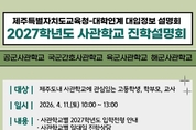 제주특별자치도교육청은 정예 장교를 꿈꾸는 도내 수험생에게 진학 정보를 제공하기 위해‘제주특별자치도교육청-사관학교 연계 2027학년도 진학설명회’를 내달 11일 오전 10시 제주특별자치도교육청 본관 4층 대회의실에서 개최한다. 이번 설명회는 오는 6월 중순부터 원서 접수가 시작되는 4개 사관학교(공군사관학교, 국군간호사관학교, 육군사관학교, 해군사관학교) 입학 관계자를 초청해 도내 학생과 보호자의 대입 접근성을 높이고 사관학교 진학에 필요한 맞춤형 정보를 제공하기 위해 마련됐다. 설명회에서는 ▲학사과정의 주요 특징 ▲2027학년도 입학전형 안내 ▲2026학년도 입학전형 결과 안내 ▲일대일 진학 상담 등을 진행하여 사관학교 진학 전략 수립에 도움을 줄 예정이다. 당일 일정은 오전 9시 30분부터 10시까지 참가자 등록을 시작으로 오전 10시부터 12시까지 사관학교별 진학설명회, 12시부터 오후 1시까지 사관학교별 진학상담 순으로 운영된다. 참가 신청은 오는 31일 오전 9시부터 4월 7일 오후 6시까지 제주진로진학지원센터 누리집 공지사항을 통해 가능하며, 사관학교별 일대일 진학 상담은 별도 신청 없이 현장에서 참여할 수 있다. 문의는 제주진로진학지원센터(064-