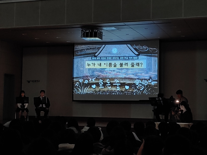 효돈중학교(교장 김통수)는 11월 27일(수)에 문화기획 예술단체‘신나는 섬’을 초청하여 왕따를 당하는 아이의 괴로움을 표현하여 학생들에게 학교폭력(왕따, 괴롭힘 등)은 나쁜 것이라는 것을 알려주는 공연을 관람하였다.