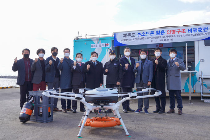 이번 수소드론 인명구조 비행훈련 시연 행사에는 원희룡 지사를 비롯해 이국종 아주대 외상연구소 교수, 정명곤 KT 상무, 서귀포해양경찰서 관계자 등이 참석했다.