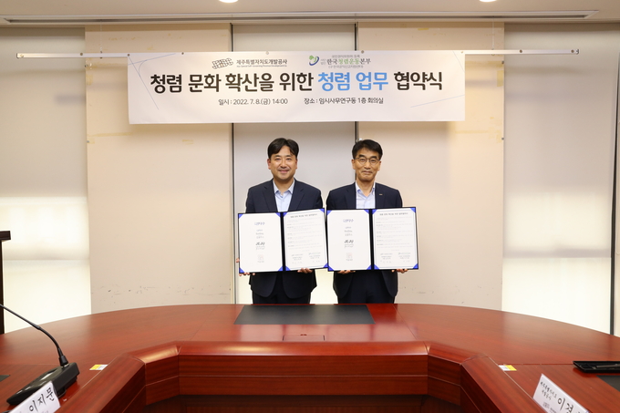 제주특별자치도개발공사(사장 김정학)가 대한민국 대표 ‘청렴’ 공기업으로 거듭나기 위해 사단법인 한국청렴운동본부(대표 이지문)와 ‘청렴 문화 확산을 위한 청렴 업무 협약을 8일 체결했다.