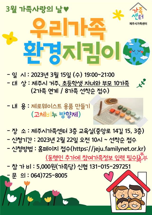 제주시가족센터(센터장 이영은)는 여성가족부와 제주시의 지원을 받는 가족복지기관으로 오는 3월부터 12월까지 2023년 가족사랑의 날 프로그램을 운영, 참가자를 모집한다.