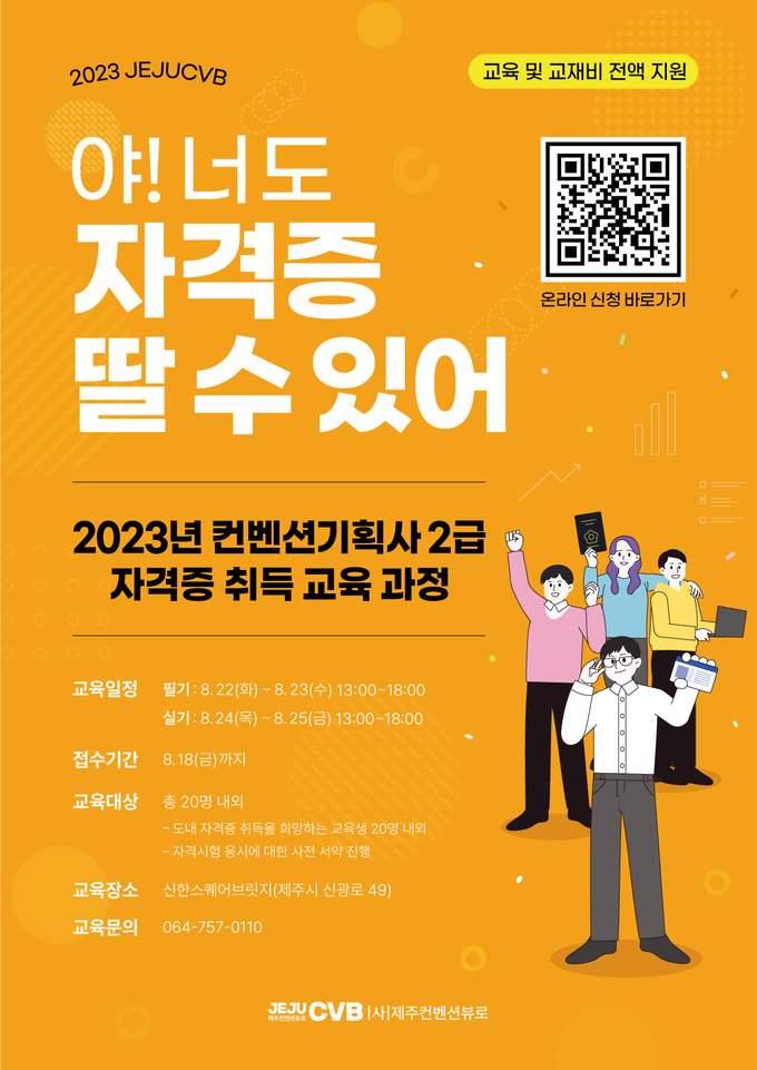제주특별자치도와 제주컨벤션뷰로(이사장 변덕승, 도 관광교류국장 겸직)는 도내 마이스 전문인력 양성을 위해 ‘컨벤션기획사 2급 자격증 취득 과정’ 하반기 교육을 운영한다.