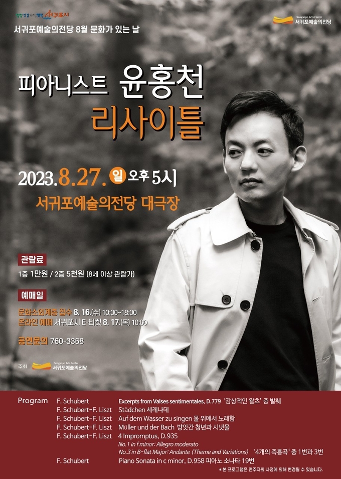 서귀포시(시장 이종우)는 8월 문화가 있는 날 기획공연으로 “피아니스트 윤홍천 리사이틀“을 8월 27일(일) 오후 5시 서귀포예술의전당 대극장에서 개최한다.