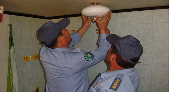 구좌 김녕의용소방대원들이 독거노인의 가정에 자동확산소화기를 설치하고 있다 |